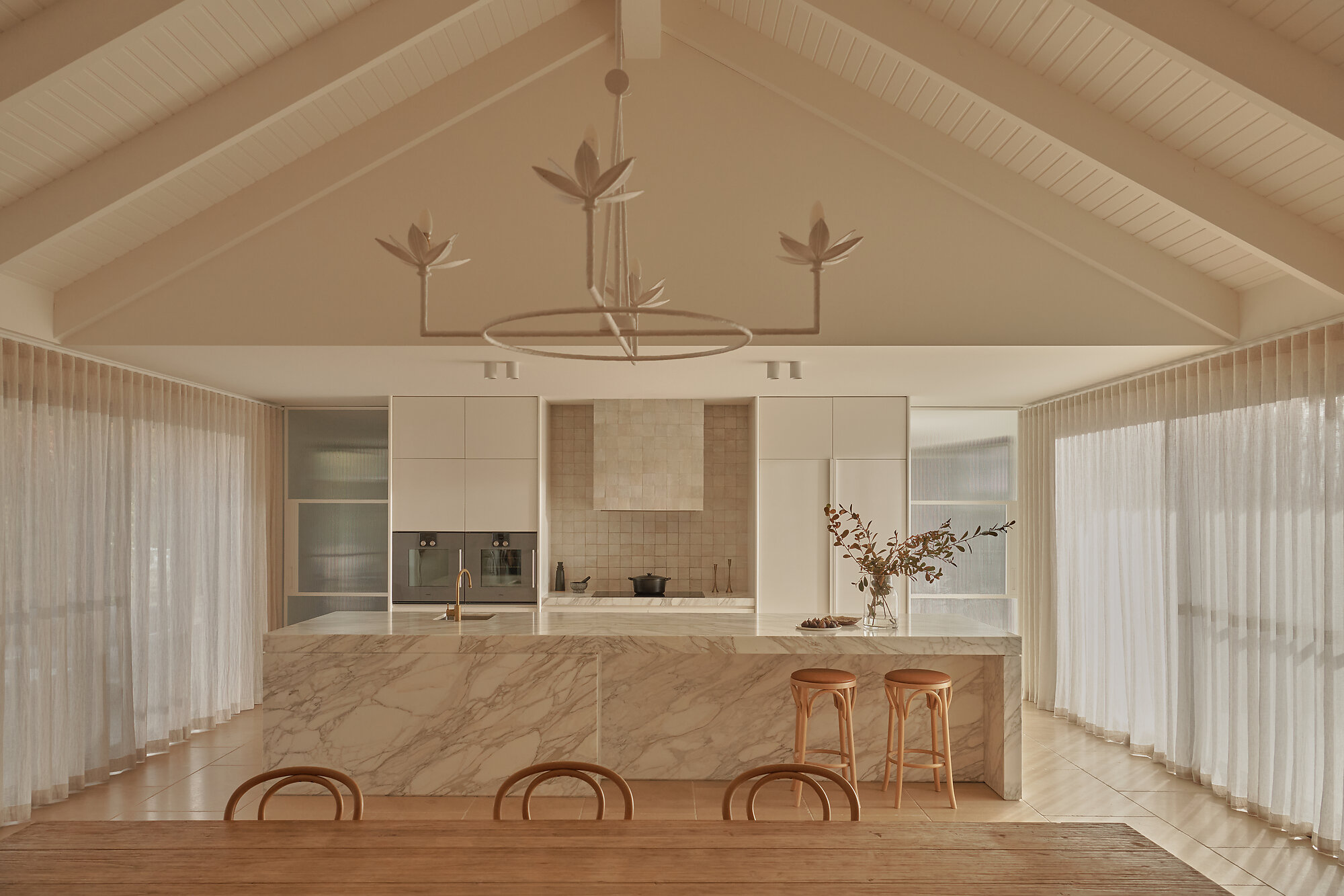 Inverleigh Farmhouse adopts a light and layered material palette to reflect the surrounding environment. Soft white hues, neutral tones, and warm timber floorboards are paired with subtle accents of natural sandstone, echoing the golden tones of the nearby paddocks. Combined with the unique quality of Australian light, this palette allows the interiors to glow with natural warmth—sunlight spills across textured walls, dances on handmade tiles, and highlights thoughtful material choices throughout the home. Aged brass hardware and soft linen curtains offer utility and a subtle reference to a traditional farmhouse.